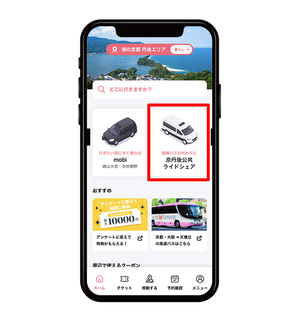 アプリのホーム画面で、京丹後公共ライドシェアのボタンをタップします