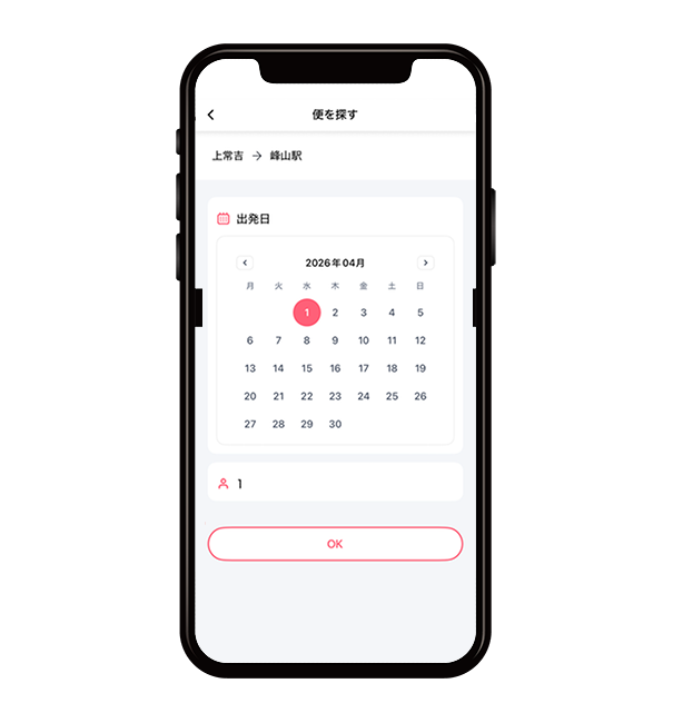 出発日カレンダーからご希望の乗車日を選択し、「OK」をタップします。